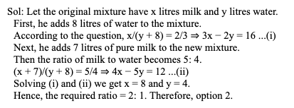 Q32. If a milkman adds 8 liters of water to a mixture of milk and water, then the ratio of milk to water in the new mixture becomes 2: 3. Again, if he adds 7 liters of pure milk to the new mixture then the ratio of milk to water becomes 5: 4. What was the ratio of milk to water in the original mixture?