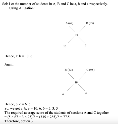 Q33. The students in class X of a school are divided into three sections A, B and C. They wrote a Talent Search Test. The average scores of A, B and C in that test were 67, 83 and 95 respectively. If the average score of the students of sections A and B together is 73 and that of sections B and C together is 89, then find the average score of the students of sections A and C together.