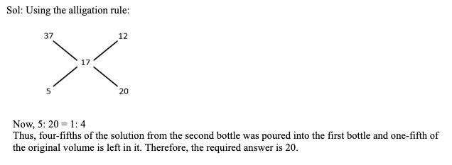 Q34. Two identical bottles are completely filled with a solution of salt and water having different concentrations. The concentration of the solution in the first bottle is 37% and that in the second bottle is 12%. A part of the solution from the first bottle is thrown away and is replaced with an equal volume of the solution from the second bottle. What percentage of solution is left in the second bottle if the concentration of the solution in the first bottle is now 17%?