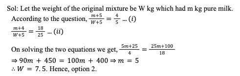 Q25. From a 4: 5, solution of milk and water, a volume equal to 25% is taken out and replaced by milk. How many times should this process be done to make the ratio of milk to water equal to 11: 5?
