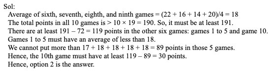 Q1. Sindhu played ten games in the badminton tournament. Her scores in the sixth, seventh, eighth, and ninth games were 22, 16, 14, and 20 points respectively. Her points-per-game average was higher after nine games than it was after the first five games. If her average after ten games was greater than 19, what is the minimum number of points she could have scored in the tenth game?