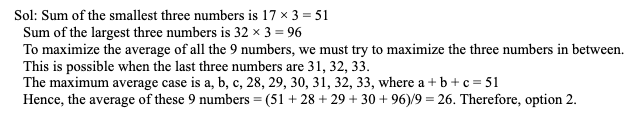Q11. There are nine distinct natural numbers such that the average of the three smallest numbers is 17, and the average of the three largest numbers is 32. The maximum possible value of the average of these nine numbers is: