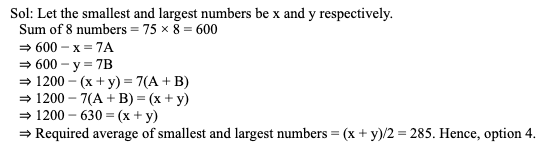 Q2. The average of 8 numbers is 75. If the smallest number is deleted, then the average of the remaining numbers is A and if the largest number is deleted, then the average of the remaining numbers is B. If A + B = 90, then what is the average of the smallest and largest numbers?