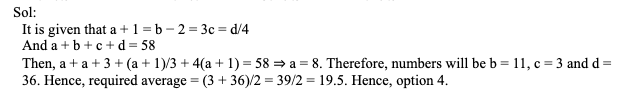 Q3. A set of four positive integers a, b, c and d in any arrangement follow the condition that a + 1 = b – 2 = 3c = d/4. If the sum of the four numbers in the set is 58, then what is the average (up to one decimal place) of the largest and smallest number in the set?
