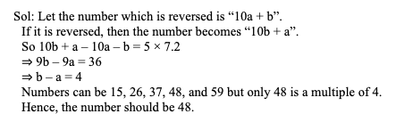 Q5. Girish finds the average of five two digits numbers. If one number is reversed and the average is taken again, then the average increases by 7.2. If all five numbers are consecutive multiples of four, then find the number which is reversed.