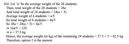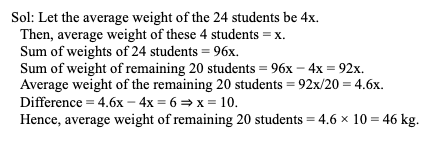 Q33. The average weight of 24 students increases by 6 kg when four of them leave the group. If the average weight of these four students is one-fourth of the average weight of the original 24 students, then what is the average weight of the remaining 20 students, in kg?