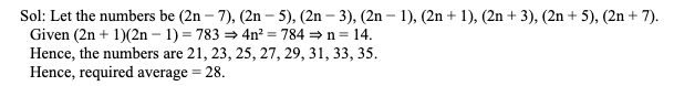 Q7. There are 8 consecutive odd natural numbers. If the product of the 4th and the 5th numbers is 783, then find the average of all the numbers.