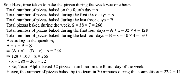 Q8. Team Alpha is planning to participate in a pizza baking competition, which has a time limit of 30 minutes. During last week, the average number of pizzas that they baked in an hour was 38, for the first four days the average was 32 and the average for the last four days was 40. Find out the number of pizzas baked by Team Alpha in the competition if they baked at the rate of the fourth day of the week.