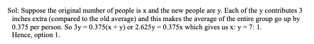 Q12. The average height of a group of people increases by 0.375 inches when a few more people join them. If the average weight of the new people is 3 inches more than that of the original group, then the ratio of the number of people present originally to those who joined later is: