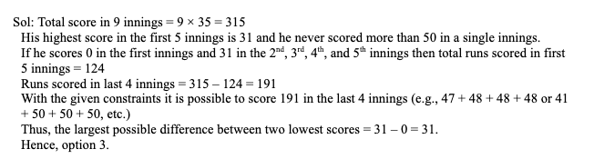 Q14. A batsman played a total of 9 innings and his average score in these 9 innings was 35. He never scored more than 50 runs in a single innings. If in the first 5 innings his highest score was 31 then the largest possible difference between two lowest scores scored in these 9 innings is: