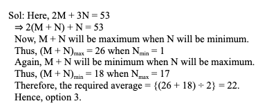 Q17. If M and N are two positive integers such that (2M + 3N) = 53, then the average of the maximum and minimum possible values of (M + N) is: