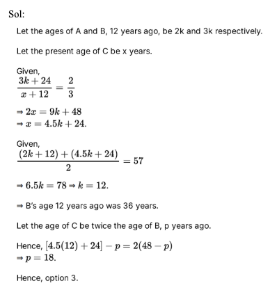 Q18. The ratio of the ages of A and B twelve years ago was 2: 3 and the ratio of the ages of B and C 12 years from now will also be 2: 3. If the average age of A and C at present is 57 years, the ratio of the ages of B and C was/will be 1: 2: