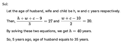 Q19. The average age of husband, wife and their child 3 years ago from now was 27 years and that of wife and child 5 years ago from now was 20 years. The age (in years) of the husband 5 years ago from now was: