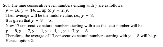 Q20. If the average of nine consecutive even natural numbers, the greatest of which is y, is x, then what is the average of 17 consecutive natural numbers, the least of which is x?