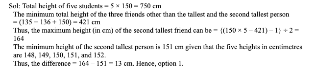 Q21. Heights of five students have distinct integer values when expressed in centimetres and can include any value from 135 to 170, both inclusive. Their average height is 150 cm and the heights of exactly two students are below this value. The difference between the highest and lowest possible height (in cm) of the second tallest person among them is: