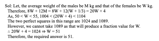 Q23. In a team of 20 young adults, 8 are females and the rest are males. The average weight (in kg) of the female members in the group is an integer which is more than 50 but less than 55, and the average weight of the group of males is 1/3 kg more than that of the females. What is the average weight (in kg) of the female members in that group, if the total weight of the whole group (in kg) is a perfect square of a natural number?