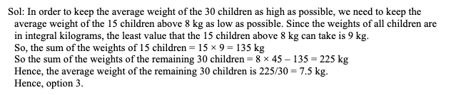 Q27. The average weight of 45 children is 8 kg. Out of these 45 children, exactly 30 have weights that are 8 kg or less. If all the children’s weights are in integral kilograms, what is the highest possible value for the average weight (in kg) of these 30 children?