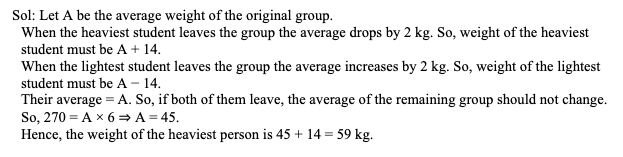 Q28. There are 8 students in a group. When the heaviest student leaves the group the average weight of the new group reduces by 2 kg. When the lightest student leaves the group the average of the new group increases by 2 kg. If both of them leave the group, then the sum of the weights of the remaining students in the group was 270 kg. What is the weight (in kg) of the heaviest student in the original group?