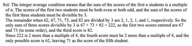 Q29. Harish, a mathematics teacher, gave a test to his five students. He entered the scores in random order into an excel sheet, which recalculated the class average after each score was entered. Harish noticed that after each score was entered, the average was always an integer. The scores (listed in ascending order) were 62, 67, 71, 73, and 82. What was the last score Harish entered?