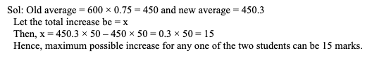 Q30. In a school, 50 students each took 6 subjects, and each subject was graded out of 100 marks. The students’ average percentage across all subjects is 75%. Two students want to re-evaluate their scores in one subject each. If their marks don’t decrease, and the new overall average becomes 75.05%, what is the maximum possible score increase for either of the two students?