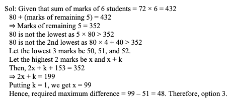 Q31. The average marks of 6 students in a test is 72. All the students got different marks, one of the students obtained 80 marks and all other students scored 50 or above. The maximum possible difference between the second highest and the second lowest marks is: