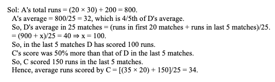 Q32. A college cricket team has 11 players and out of them A, B, C, D, and E have scored runs at an average of 30, 40, 35, 45, and 50 respectively, in the first 20 matches of the season. In the next 5 matches, A and B scored 200 runs each whereas C’s score was 50% more than that of D. After 25 matches, if A’s new average score is 4/5th that of D, what is the average score of C?
