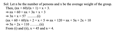 Q34. In a group with a certain number of people, if one new person weighing 60 kg is added, then the average weight of the group increases by 3 kg. If one more person weighing 60 kg is added, then the average weight of the group increases by an additional 2 kg. What is the average weight (in kg) of the original group?