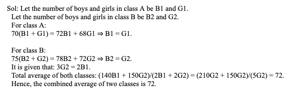 Q36. In a school, students of two classes: A and B participated in a Maths competition. The average score of the students of class A is 70, and the average scores of boys and girls of class A are 72 and 68 respectively. For class B: the average score of the class is 75; and the average score of the boys and girls are 78 and 72 respectively. If thrice the number of girls in class B is twice the number of boys in class A, what is the average score of the students of the two classes combined?