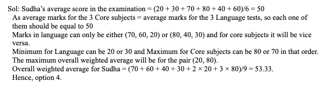 Q37. An examination consisted of 6 tests out of which 3 were Language and 3 were Core subjects. The marks obtained by Sudha in the 5 tests were 20, 30, 70, 80, 40, and 60. The average marks obtained by her in Language and Core subjects were the same. A student has to have a minimum cut off to be eligible for a scholarship. While calculating the ‘overall weighted average’ for the examination, the test with the minimum score among the Language tests was given twice the weight and the test with the maximum score among the Core subjects was given thrice the weight as compared to others. The maximum ‘overall weighted average’ would be closest to: