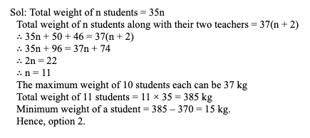 Q38. There are total ‘n’ students in a group. The average weight of these ‘n’ students along with their two teachers is 37 kg. The weights of the two teachers are 50 kg and 46 kg. The weight of none of the students is more than 37 kg. What can be the minimum weight of a student if the average weight of the ‘n’ students is 35 kg?