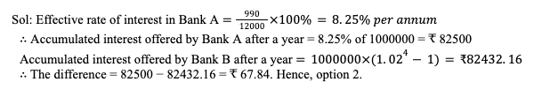 Q32. Bhushan deposited 12000 in Bank A for one year and after one year the amount increased to 12990 because of interest accumulation. There is another bank, Bank B, which offers 8% interest per annum compounding quarterly. What would be the difference in the interest offered by the two banks on Rs 1000000 after one year?