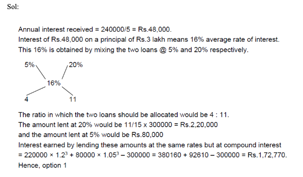 Q33. Neeta had Rs.3 lakh and she lent a part of it at 5% simple interest and the remaining at 20% simple interest. The total amount received by her after 5 years was Rs. 2,40,000. If the same amounts were lent at the same rates but at compound interest per annum for 3 years, then what would be the interest received by Neeta?