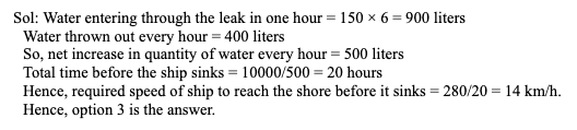 Q1. A ship is 280 km away from the shore and it springs a leak at the bottom through which 150 liters of water enters the ship every 10 minutes. The ship has a pump that can throw out 400 liters of water per hour. The ship will sink if the water inside is more than 10,000 liters. What should be the minimum speed (in km/h) of the ship so that it reaches the shore before it sinks?