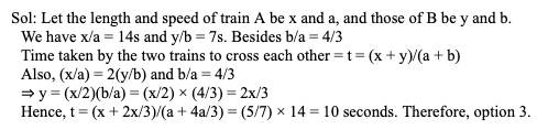 Q10. Two trains A and B begin to enter a tunnel simultaneously at opposite ends on parallel tracks. While train A takes 14 seconds to completely enter the tunnel, train B takes only 7 seconds. Train B is 4/3 as fast as A. How much time (in seconds) do the two trains take to cross each other completely?