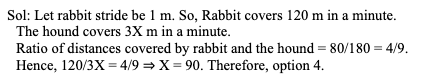 Q11. A rabbit and a hound start from A and B simultaneously moving towards B and A respectively. The hound after reaching A turns around and moves towards B. The rabbit still has 20% distance to cover to reach B, when the hound overtakes it. The speed of the rabbit is 120 strides/minute and that of the hound is X strides/minute. If the ratio of the lengths of the strides of the rabbit and the hound is 1: 3, find X.