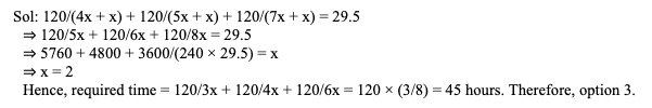 Q12. A boat covers a total distance of 360 km downstream in three equal parts with the speed of boat be 4x km/h, 5x km/h and 7x km/h respectively. If the speed of stream is x km/h and boat take total of 29.5 hours, then find the time (in hours) boat will take to cover the given distance upstream in three equal parts with three given speeds.