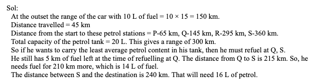 Q13. Sohan is going on a long drive of 600 km. His car gives him a uniform mileage of 15 km per L of petrol. At the start of the journey the car has 10 L of fuel. The capacity of the fuel tank is 20 L. After driving for 45 km, Sohan reads a road sign showing the distances from that point to five petrol stations ahead on the road. These distances are P-20 km, Q-100 km, R-250 km, S-315 km. If he wants to keep the average fuel content in his tank to be as low as possible while making only two stops for refuelling, which of the following statements is true?