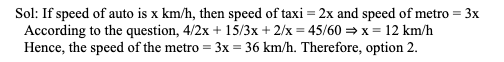 Q14. A person going from home to work travels 4 km by taxi, 15 km by metro, and 2 km by auto. The journey takes 45 minutes, and the speed of the metro is three times that of the auto and 1.5 times that of the taxi. Find the speed (in km/h) of the metro.