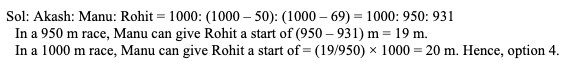 Q15. In a 1000 m race Akash, Manu, and Rohit are the three participants. Akash, Manu, and Rohit can complete the race in the same time if Akash gives Manu a start of 50 m and Rohit a start of 69 m. The start (in m), which Manu can give Rohit is: