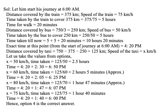 Q18. A person travels to Kochi which is 750 km from Goa. He travels half of the distance by train then takes 20 minutes to reach the bus stop. He then covers one-third of the distance by bus and then takes a taxi to cover the remaining distance. If the speed of train, bus and taxi are 75 km/h, 50 km/ h and x km/h respectively, then what is true about the value of x such that he completes his journey in maximum of 12 hours?