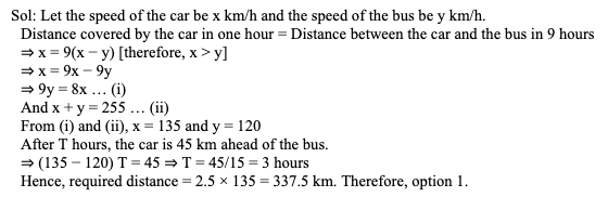 Q19. A car and a bus start from a same point in the same direction. After ‘T’ hours the car is 45 km ahead of the bus, while after ‘9’ hours distance between the car and the bus is same as distance covered by the car in one hour. If relative speed of the car and the bus if they move towards each other is 255 km/h, then how much distance (in km) can the car cover in (T – 1/2) hour?