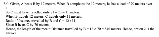 Q2. In a race of three athletes, A beats B by 12 meters and C by 81 meters. If B beats C by 70 meters, what was the length of the race (in meters)?