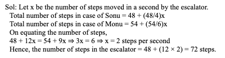 Q20. Sonu and Monu are climbing on a moving escalator that is going up. Sonu takes 48 steps to reach the top but Monu takes 54 steps to reach the top. Sonu can take 4 steps in a second while Monu can take 6 steps in a second. Calculate the total number of steps in the escalator.