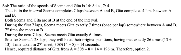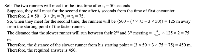 Q30. Two racers are running to and fro from the two opposite end points of a 500-metre-long straight running track starting simultaneously from the two end points with uniform speeds of 3 m/s and 7 m/s. What will be the distance (in metres) of the slower runner from his starting point when he meets the faster runner for the third time?