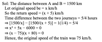 Q22. A train travels from Station A to Station B covering a distance of 1500 km in time. On the return journey, it starts 1 hour 15 minutes late due to a technical problem, so the driver increases the average speed of the train by 5 km/h to reach on time. Find the original speed (in km/h) of the train.