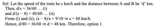 Q23. A train takes 36 minutes to travel a distance between station A and station B. However, if the train’s speed is reduced by 8 km/h, it takes 40 minutes to cover the same distance. What is the distance (in km) between stations A and B?