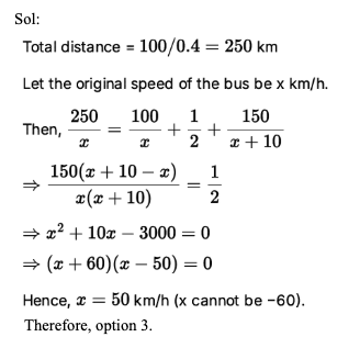 Q25. A bus departed from city P towards city Q. After traveling 100 km, it encountered a road blockage and came to a stop for 30 minutes. At that point, the bus had covered 40% of the total distance. Once it resumed its journey, the driver increased the speed by 10 km/h and managed to arrive at city Q on time. What was the bus’s original speed (in km/h)?