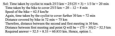 Q6. A cyclist travelled from point P to Q at the constant speed of 25 km/h. When he covered the distance of 25/3 km, he was overtaken by a bike that left point P, 12 minutes after the cyclist and travelled at a constant speed too. When the cyclist travelled another 30 km, he encountered the bike returning from Q. Assume that the bike did not stop at point Q. Find the distance (in km) between P and Q.