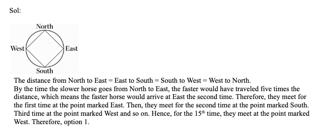 Q7. The village of Himmatnagar has an annual horse race in which the horses are required to cover the shortest path while touching all the four points (North, East, South, West) respectively marked at equal distances on the circumference of a circular race track. There were just two horses and one of them was five times as fast as the other. If they both start from the point marked in the North and move in a clockwise direction, where will they meet for the 15th time after they start?