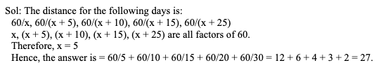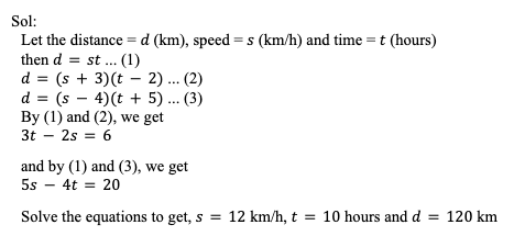 Q36. Had a person traveled 3 kmph faster he would have taken 2 hours less to cover a certain distance. Had he traveled 4 kmph slower he would have taken 5 hours more to cover the same distance. Find the distance (in km) he needs to cover.